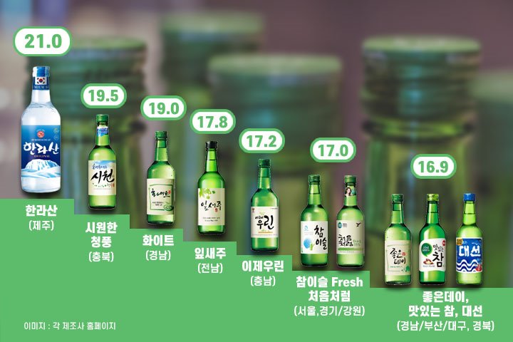 ■ 서울·경기 : 하이트진로 '참이슬' 후레쉬(17.8%) , 클래식(20.1%) ■ 강원도 : 롯데주류 '처음처럼' 17% ■ 충청남도.대전 : 맥키스컴퍼니 '이제우린' 17.2%